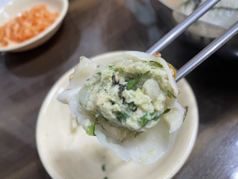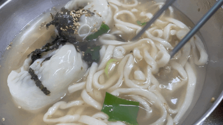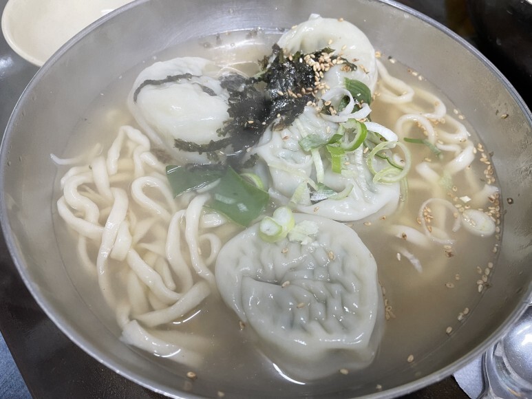 진한 멸치육수가 감칠맛 나고 왕만두 4개가 들어 있습니다.
