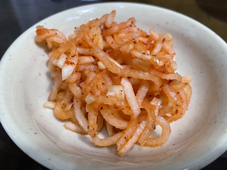 배추김치 대신에 테이블마다 무생채무침이 있습니다.
